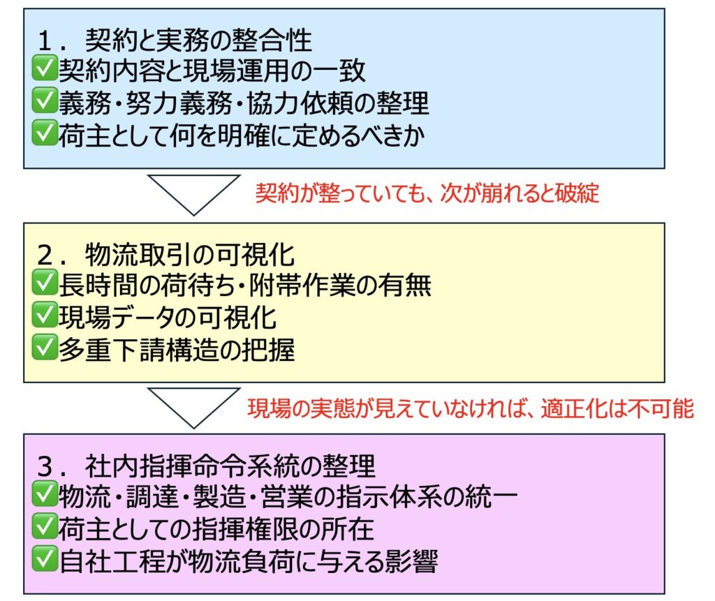 特定運送委託が下請法の対象となったことで、荷主企業には次の3つの領域での適正化と可視化が強く求められるようになりました。