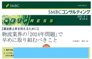 SMBCコンサルティングが発行する「Netpress」第2196号(2022年8月1日発行)に【運送費上昇を抑えるために】物流業界の「2024年問題」で早めに取り組むべきことというテーマで掲載されました。「Netpress」は税金や法律など経営に関するタイムリーで身近なトピックスをA4 2枚でまとめられたコラム集です。ぜひ、一読いただけますようよろしくお願いいたします。