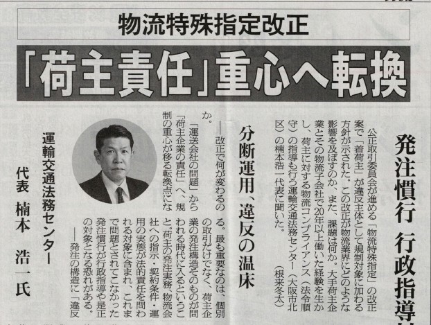 当法人は、「物流特殊指定」改正に関する専門家として業界紙等に取り上げられました。今回の改正では、「着荷主」が新たに違反主体として位置付けられる方向性が示され、物流における責任の所在が大きく見直されようとしています。